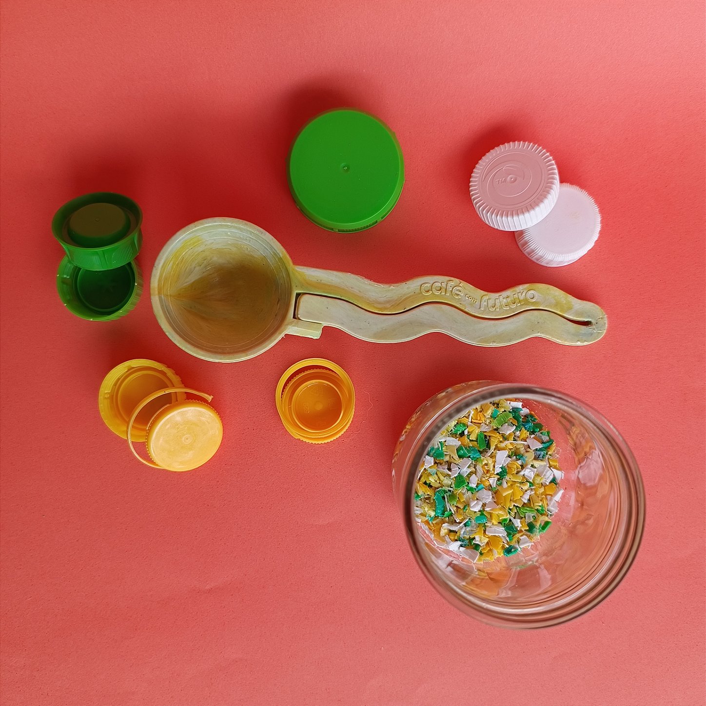 Atualmente, a matéria prima que usamos é a partir da trituração de tampas plásticas do tipo polipropileno (plástico número 5) compradas da ONG EcoPatas, na cidade de São Paulo, que recebe doações de tampinhas plásticas e com a venda investe em cuidados com animais de rua.