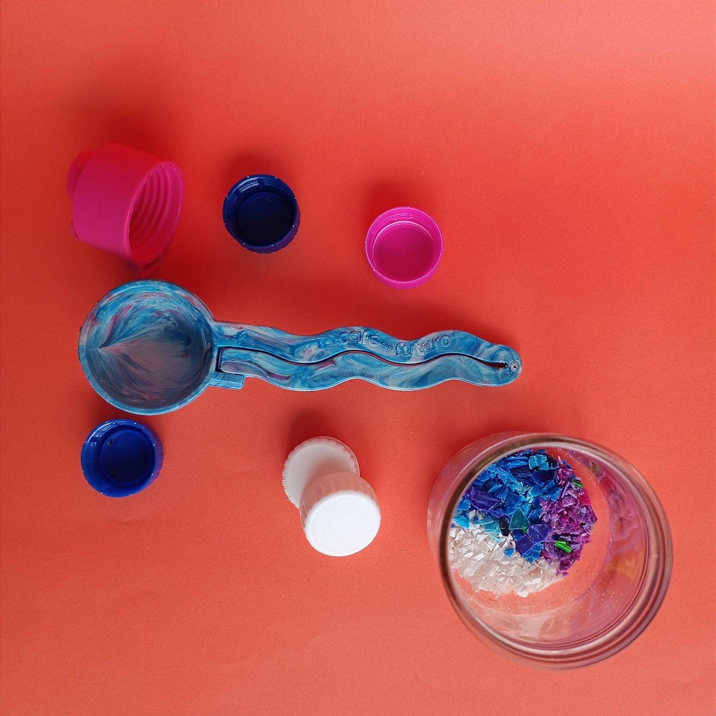 O Dosador do Futuro é o primeiro acessório 2 em 1: colher medidora de café e prendedor de embalagens do mundo, feito 100% com plástico reciclado!