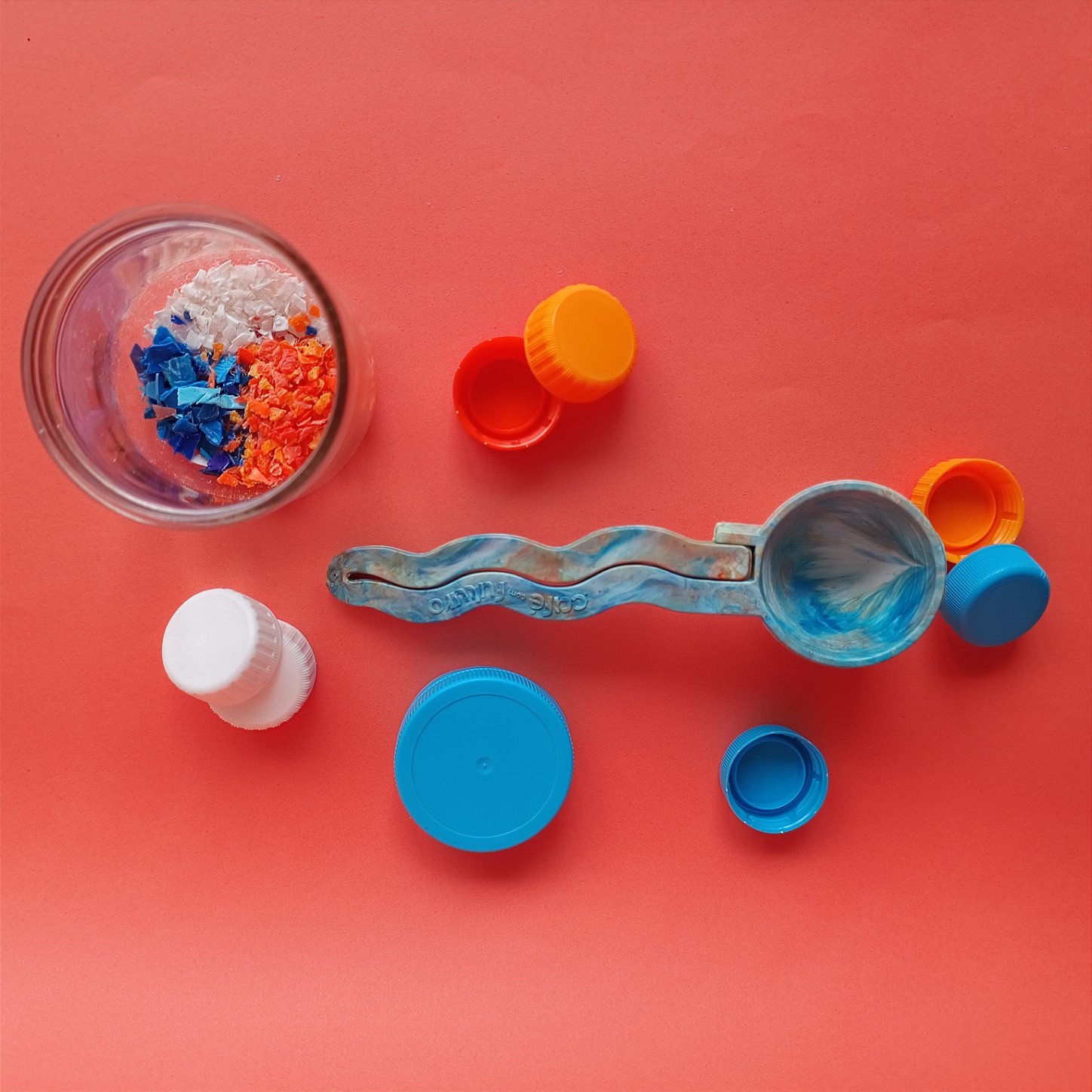 Atualmente, a matéria prima que usamos é a partir da trituração de tampas plásticas do tipo polipropileno (plástico número 5) compradas da ONG EcoPatas, na cidade de São Paulo, que recebe doações de tampinhas plásticas e com a venda investe em cuidados com animais de rua.