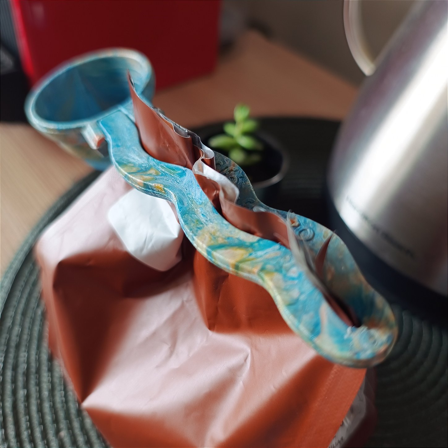 Com um design inspirado em prendedores de cabelo feitos com plástico reciclado, o cabo do Dosador do Futuro permite que você guarde da melhor maneira seus pacotes de café e evite que estraguem mais rápido.