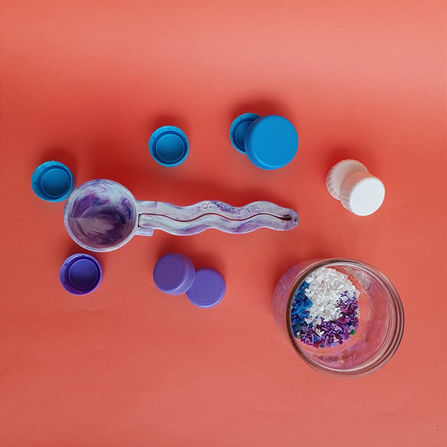 Atualmente, a matéria prima que usamos é a partir da trituração de tampas plásticas do tipo polipropileno (plástico número 5) compradas da ONG EcoPatas, na cidade de São Paulo, que recebe doações de tampinhas plásticas e com a venda investe em cuidados com animais de rua.