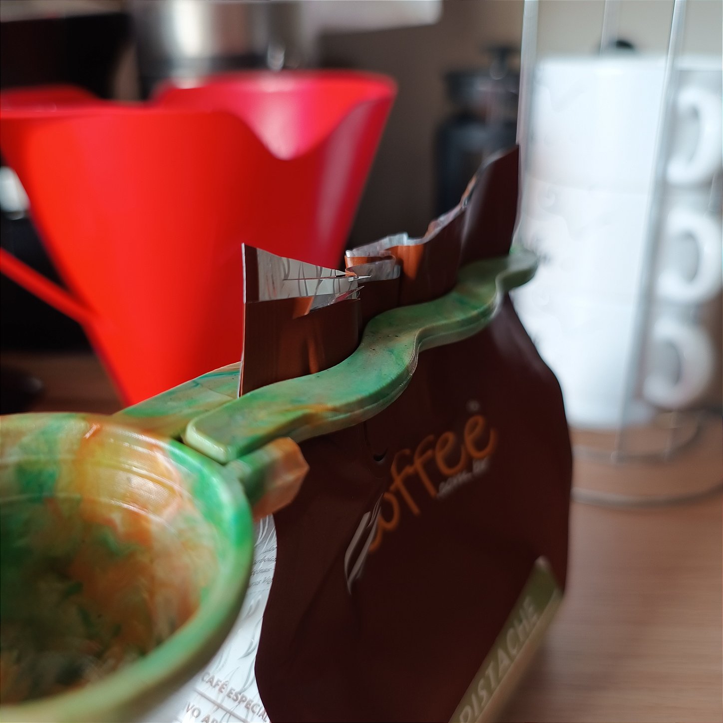 Com um design inspirado em prendedores de cabelo feitos com plástico reciclado, o cabo do Dosador do Futuro permite que você guarde da melhor maneira seus pacotes de café e evite que estraguem mais rápido.