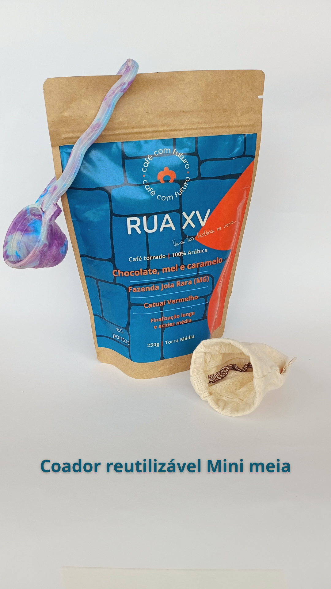 Trio: Café Rua XV + Coador reutilizável + Dosador do Futuro (Cores 2)